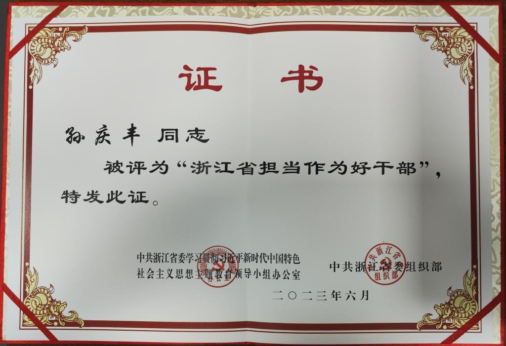 6月30日,省委學習貫徹習近平新時代中國特色社會主義思想主題教育專題黨課暨激勵干部擔當作為表彰大會在杭州召開,省委書記易煉紅出席會議并講話。大會表彰了一批擔當作為好干部,我校化學與材料工程學院院長、黨委副書記,國家木質資源綜合利用工程技術研究中心常務副主任孫慶豐同志榮獲“浙江省擔當作為好干部”稱號。
