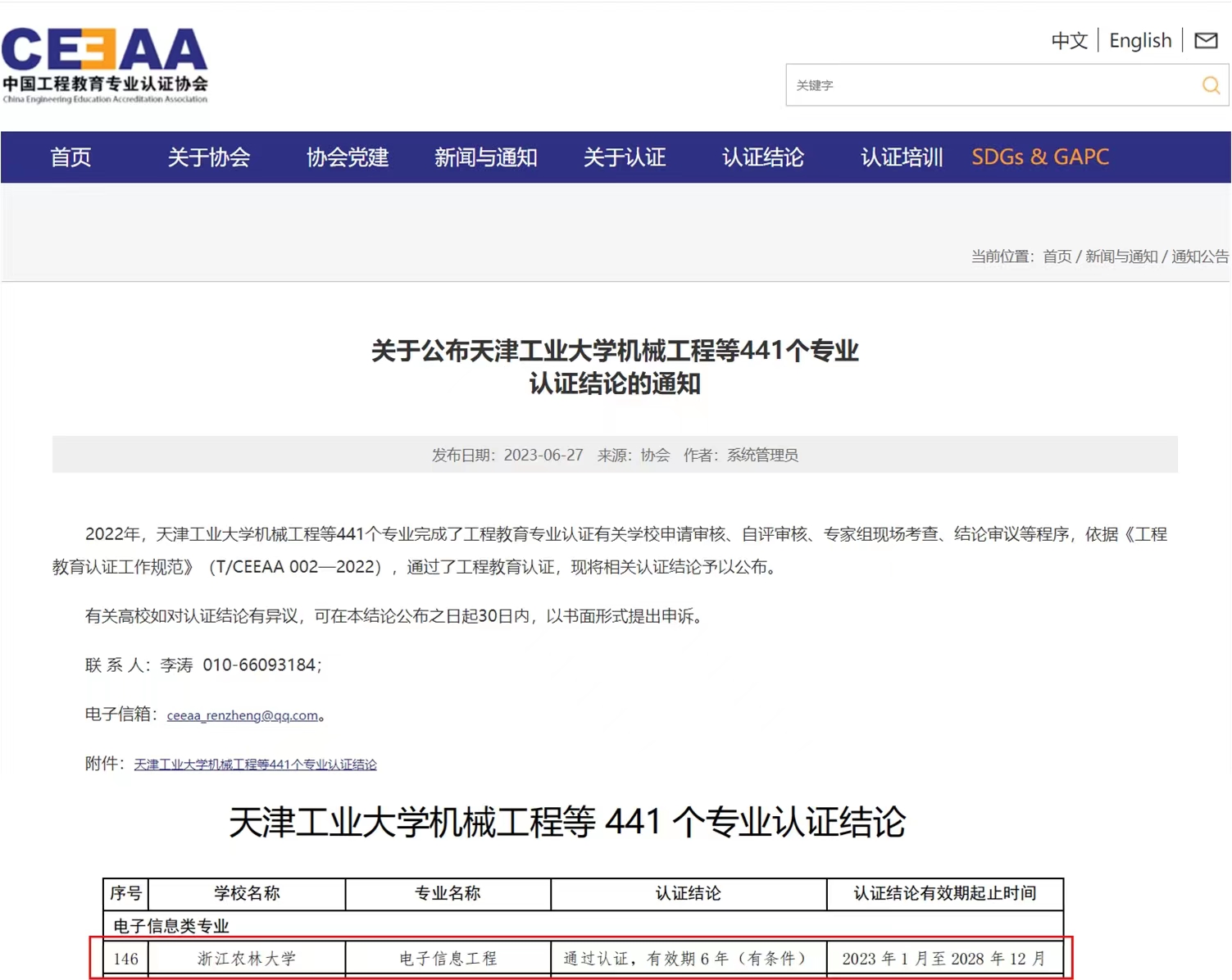據悉,此次公布通過認證的441個專業名單中,電子信息工程專業有21個。我校成為全國農林類高校首批通過電子信息工程專業認證的高校。截止目前,我校已有2個專業通過工程教育專業認證,為學校工科專業的建設和發展提供了成功的經驗。