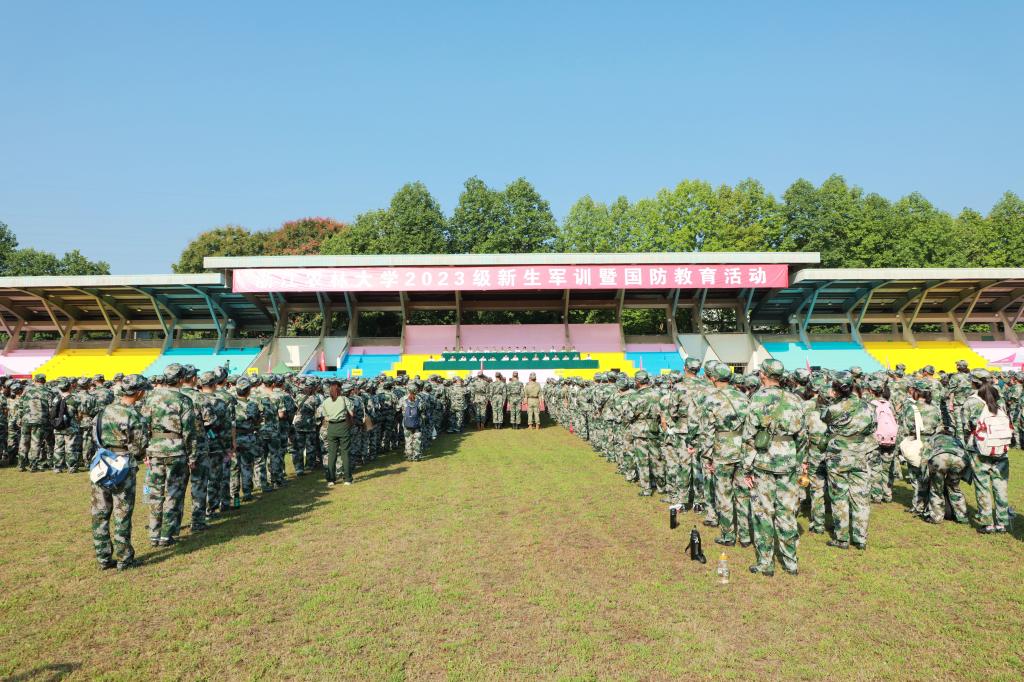 在莊嚴的國歌聲中,2023級新生軍訓暨國防教育活動動員大會拉開帷幕。