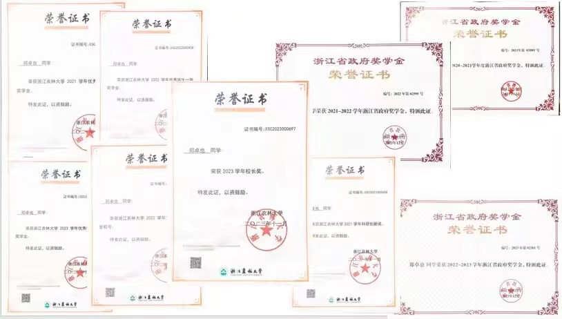 鄭卓也,動科動醫學院動物科學專業201班學生,浙江農林大學2023年本科生校長獎獲得者。他品學兼優,多次獲得校一、二等獎學金,三次獲得省政府獎學金,曾獲2021年校三好學生榮譽稱號,入選浙江省新苗人才計劃;他求實上進,積極參加競賽,獲全國大學生生命科學競賽國家一等獎,國際大學生數學建模競賽國家二等獎、中國大學生數模競賽省二等獎。此外,他還曾獲挑戰杯省二等獎、東湖杯校一等獎、統計調查大賽校二等獎、2020年科研創新獎等多項獎項。