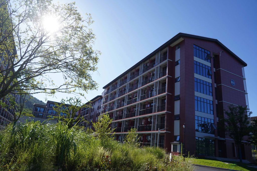 紅墻褐頂的新農科大樓在藍天白云的映襯下,