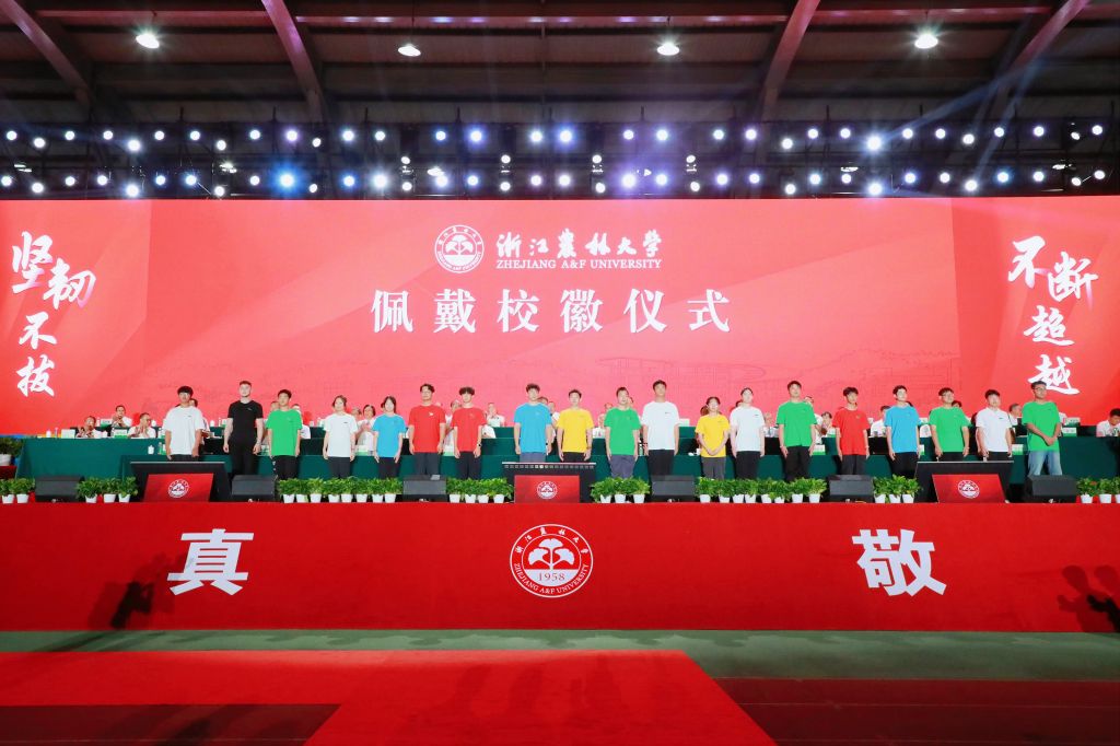 校領導為新生代表佩戴校徽,全體新生共同佩戴?;铡P;帐菍W校的象征與標識,更是全體學生與教職工的榮耀與自豪。戴上校徽,新生們就永遠烙上了浙農林大印記,從此與學校同呼吸、共命運。