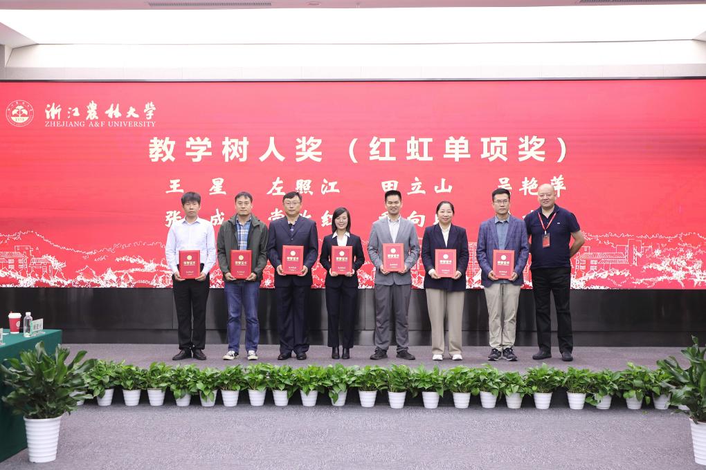 大會表彰了2024年度本科卓越教學教師(“紅虹”獎教金獲得者)。胡祖吉宣讀表彰文件,方志剛和周維亮為獲“教學卓越獎”的老師頒獎;“紅虹”獎教金捐贈方代表、經濟林87級校友、上海紅虹木業有限公司總經理丁岳軍為獲“教學樹人獎”和“教學英才獎”的老師頒獎。