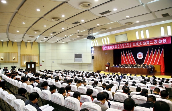 大會聽取并審議了學校工作報告,審議通過《浙江農林大學“十三五”規劃綱要》,審議了學校財務工作報告,工會工作報告,工會財務工作報告、工會經費審查報告,聽取并審議了九屆一次“雙代會”提案處理情況報告,通過調整后的主席團成員及秘書長建議名單,審議了《關于東湖校區部分樓宇等命名的建議方案(審議稿)》、《浙江農林大學師生生態文明行為規范(審議稿)》,通過了大會決議。