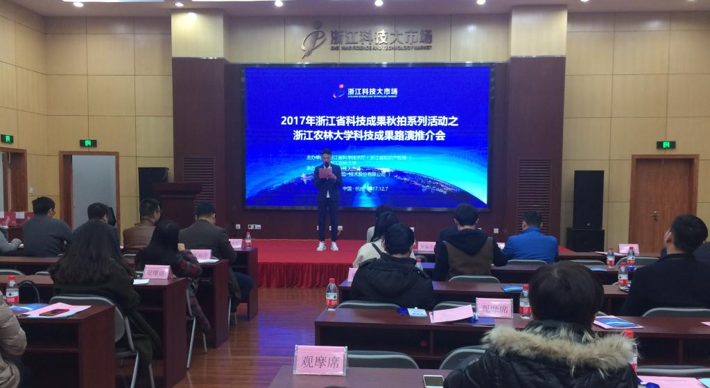 12月7日,2017浙江省科技成果秋拍系列活動之浙江農林大學科技成果路演推介會在浙江科技大市場順利舉行。本次活動由浙江省科技廳、浙江農林大學主辦,浙江科技大市場承辦,活動現場共有8項路演推介科技成果和6項展示推介科技成果。省科技廳成果處,浙江農林大學創業處,省內相關科技型企業、投資機構和科技中介等負責人以及媒體記者參加推介會。