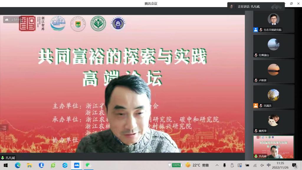 11月26日至27日,由浙江省社科聯與浙江農林大學共同主辦的“共同富裕的探索與實踐”高端論壇在杭州舉行。論壇由浙江農林大學生態文明研究院、碳中和研究院、經濟管理學院、浙江省鄉村振興研究院共同承辦,浙江省生態文明智庫聯盟、浙江省共同富裕智庫聯盟共同協辦。會議采取線上線下同步進行,分主旨報告、平行論壇、課題推進會三個環節組成。