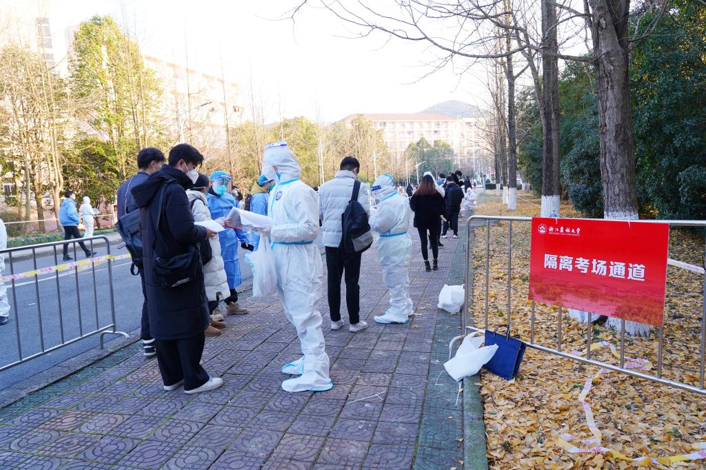 浙江農林大學考點在設立86個正式考場的同時,還專門設立了隔離考場、備用考場,確保有充足的隔離考場、備用考場,以及相應的專用出入通道??荚嚻陂g,學校還設立考研學生專用食堂,所有考研學生可以在該食堂就餐、休息。核酸監測陽性考生進入考場后,中間將不出考場,午餐由學校后勤人員專門配送到考場,考生吃完后,由專人回收并進行處理。