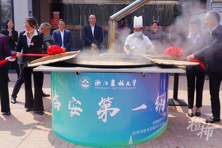 咕嘟咕嘟,熱氣騰騰的大鐵鍋里,散發(fā)出了濃郁的鮮香。隨著主持人一聲令下,鐵鍋的蓋子正式開(kāi)啟,師生人手一份,共同品嘗剛剛出鍋的咸肉春筍,感受這來(lái)自春天的味道。“這道菜用了1500斤臨安本地的雷筍和300斤遂昌的咸豬肉,用直徑1.5米的大鐵鍋燉了3個(gè)多小時(shí)。”浙江農(nóng)林大學(xué)餐飲部的葉經(jīng)理說(shuō)。