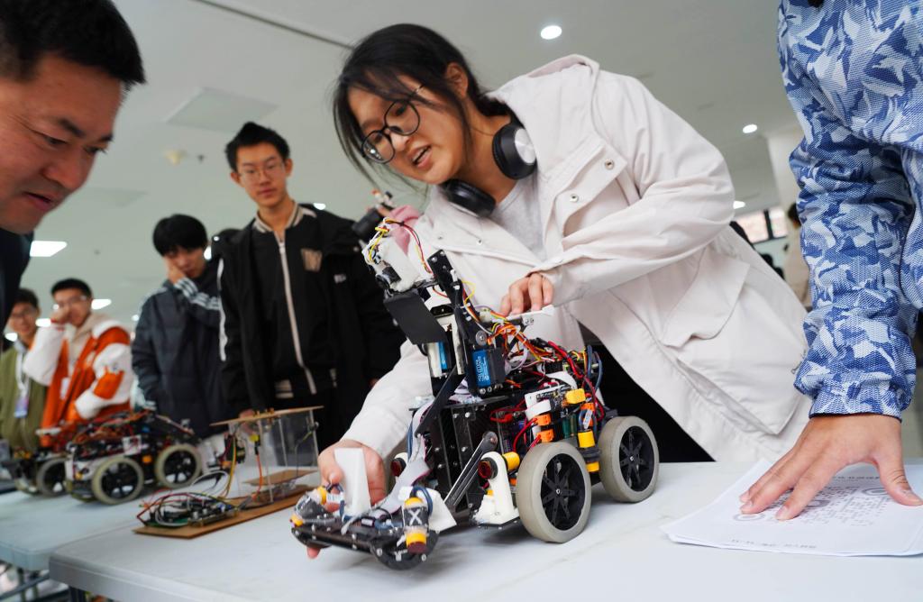 近日,在浙江農(nóng)林大學(xué)舉行的“芯光智+”科技文化節(jié)上,一名學(xué)生正在向師生展示她和同學(xué)研發(fā)的機(jī)器人。