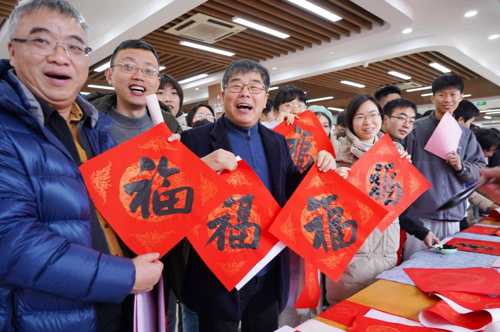 1月15日,浙江農(nóng)林大學書法協(xié)會的師生們給陸續(xù)放寒假回家的老師、同學書寫“福”字、春聯(lián)等,讓大家能夠開開心心帶著學校的“福”氣返鄉(xiāng)過年。