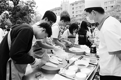 4月13日,浙江農林大學舉辦“筍”宴系列活動。圖為師生代表和后勤員工一起制作特色點心筍干包。