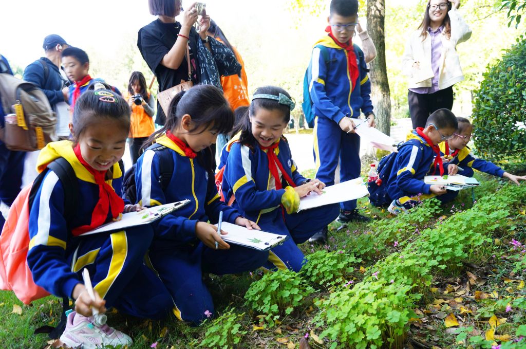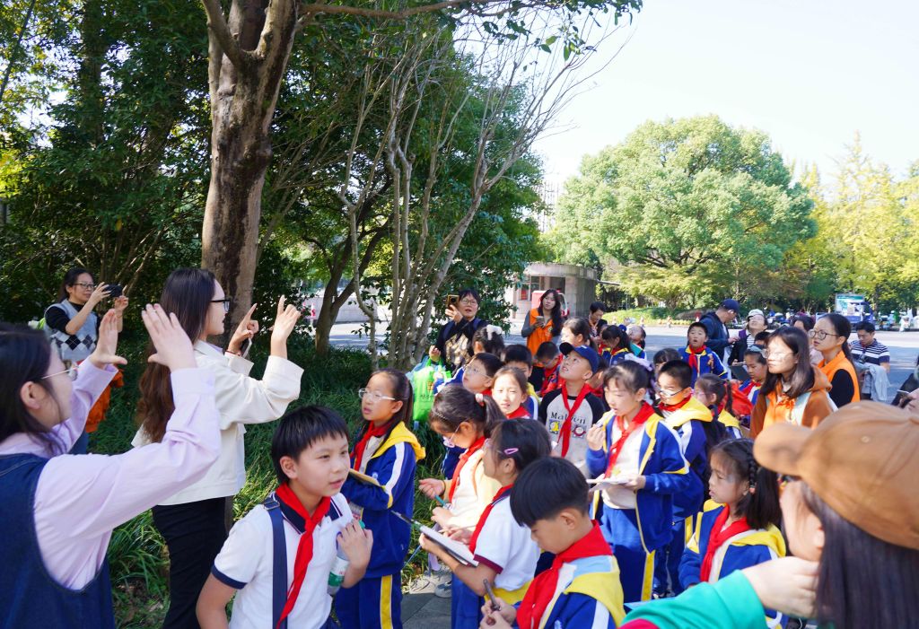2024年11月3日,杭州,一批小學(xué)生在浙江農(nóng)林大學(xué)東湖校區(qū)的校園里開展生態(tài)主題研學(xué)活動,在志愿者指導(dǎo)下學(xué)習(xí)辨認(rèn)各種植物的形狀及特征。浙江農(nóng)林大學(xué)是國家生態(tài)文明教育基地,校園里種植有各種植物種類近3500種,已經(jīng)成為周邊大中小學(xué)生開展生態(tài)主題研學(xué)、學(xué)習(xí)植物知識的重要基地。