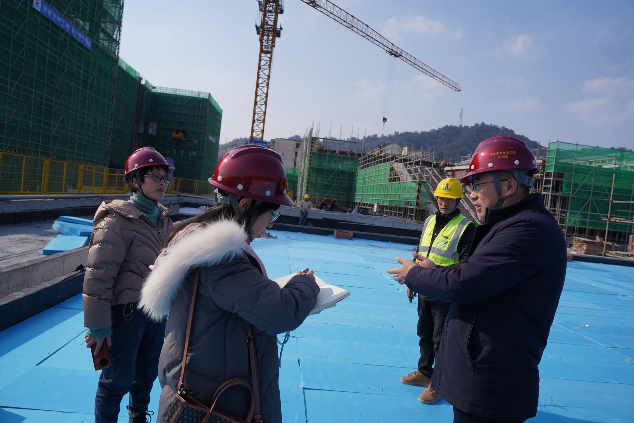 塔吊、臂架式混凝土泵車、升降機幾乎不間斷的向快結頂的幾幢建筑樓上方運輸材料,近百名工人忙碌穿梭其間……盡管在校生們已放寒假,但本該日漸冷清的浙江農林大學校園里,依然熱火朝天。