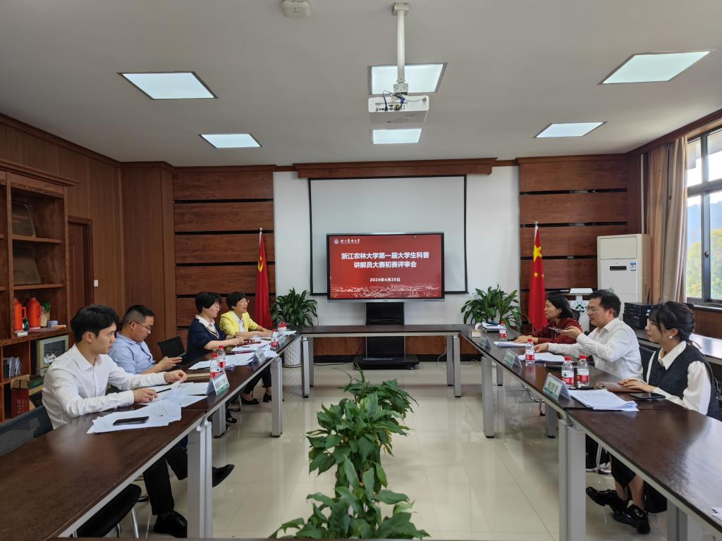 4月29日下午,浙江農林大學第一屆大學生科普講解員大賽初賽評審會在學15-612召開。校黨委宣傳部、人文社會科學處、植物園管理辦公室、校團委、現代農學院、校演講與口才協會相關領導嘉賓參與會議并擔任評審。