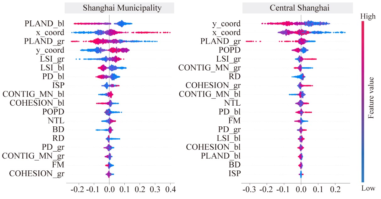 文章利用XGBoost和SHAP模型以及部分依賴關系圖,以上海市域和中心城區為研究的不同尺度,分析社會經濟、建成環境、藍綠空間格局三個方面的變化量與地表溫度等級變化的貢獻重要性。研究結果強調了上海市域尺度和中心城區尺度城市熱環境影響因子貢獻度有所不同,藍綠空間格局變化量在市域尺度相對重要性高,社會經濟和建成環境變化量在中心城區尺度相對重要性高,各因子在空間上的貢獻程度在不同尺度上也不同,大部分因子與城市熱環境存在非線性關系。文章深入研究了城市熱環境的尺度效應,為緩解城市熱環境問題制定城市規劃策略提供思路。