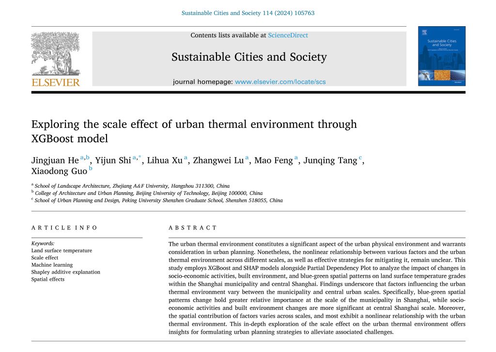 近日,園林學院城鄉生態環境評估與規劃團隊在國際權威刊物《Sustainable Cities and Society》(中科院一區TOP,IF: 10.5)上發表題為《基于XGBoost模型的城市熱環境尺度效應研究》(Exploring the scale effect of urban thermal environment through XGBoost model) 的學術論文。浙江農林大學為該論文第一單位和通訊作者單位。該團隊施益軍副教授為通訊作者,研究生何靜娟為第一作者,徐麗華教授、陸張維副教授、馮矛老師等共同參與。